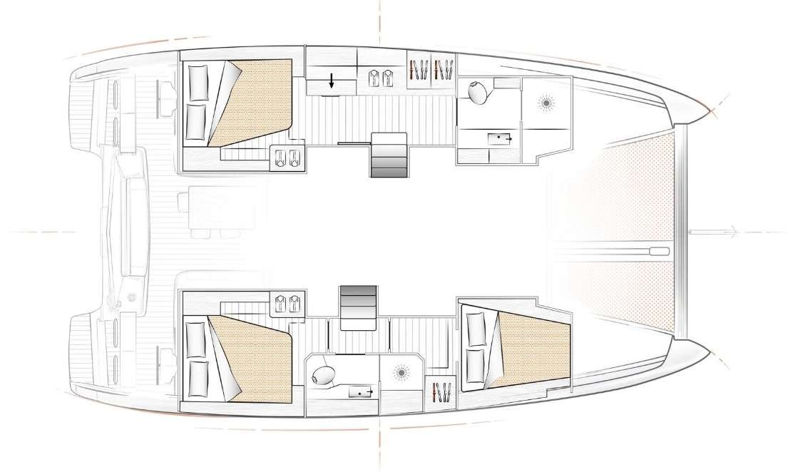 Enjoy the comfort of your home while sailing in style. This modern Owner version catamaran can accommodates up to 6 guests in 3 spacious cabin (1 master cabin + 2 doubles) plus 1 crew forepeak cabin in the bow, and is designed to offer the perfect blend of relaxation and performance.